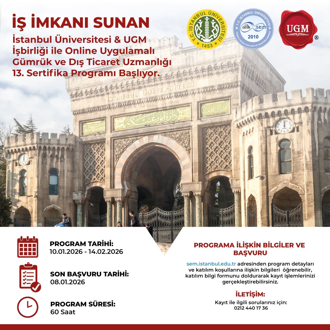 Ders Programını Görmek için: https://sem.istanbul.edu.tr/tr/content/uygulamali-gumruk-ve-dis-ticaret-uzmanligi-sertifika-programi/ders-programi